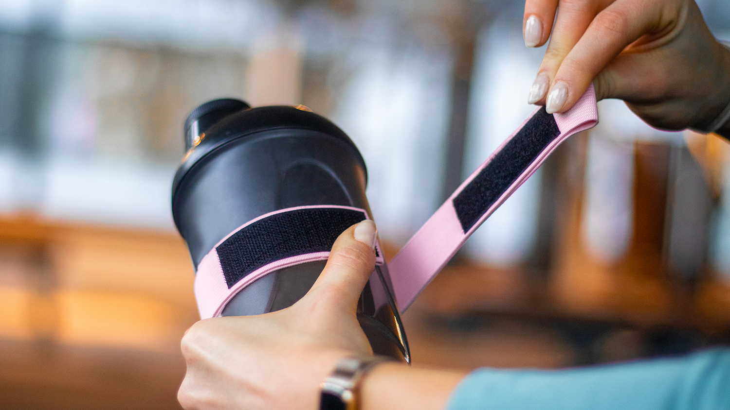 SHAKEBAND ist ein elastisches Band, welches du mit Hilfe des angebrachten Klettverschlusses einfach und schnell um jede Flasche anbringen kannst.